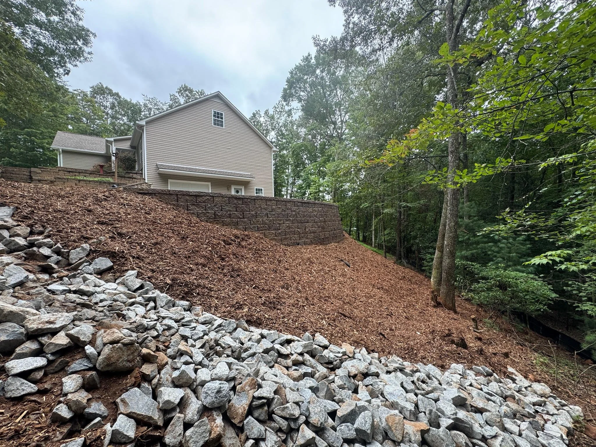 Landscaping a sloped yard requires careful grading, drainage planning, and plant selection. In mountain areas like Ellijay and Blue Ridge, landscaping solutions often include erosion control, terraced planting beds, retaining walls, and strategic drainage systems to stabilize the land while improving the appearance of the property.